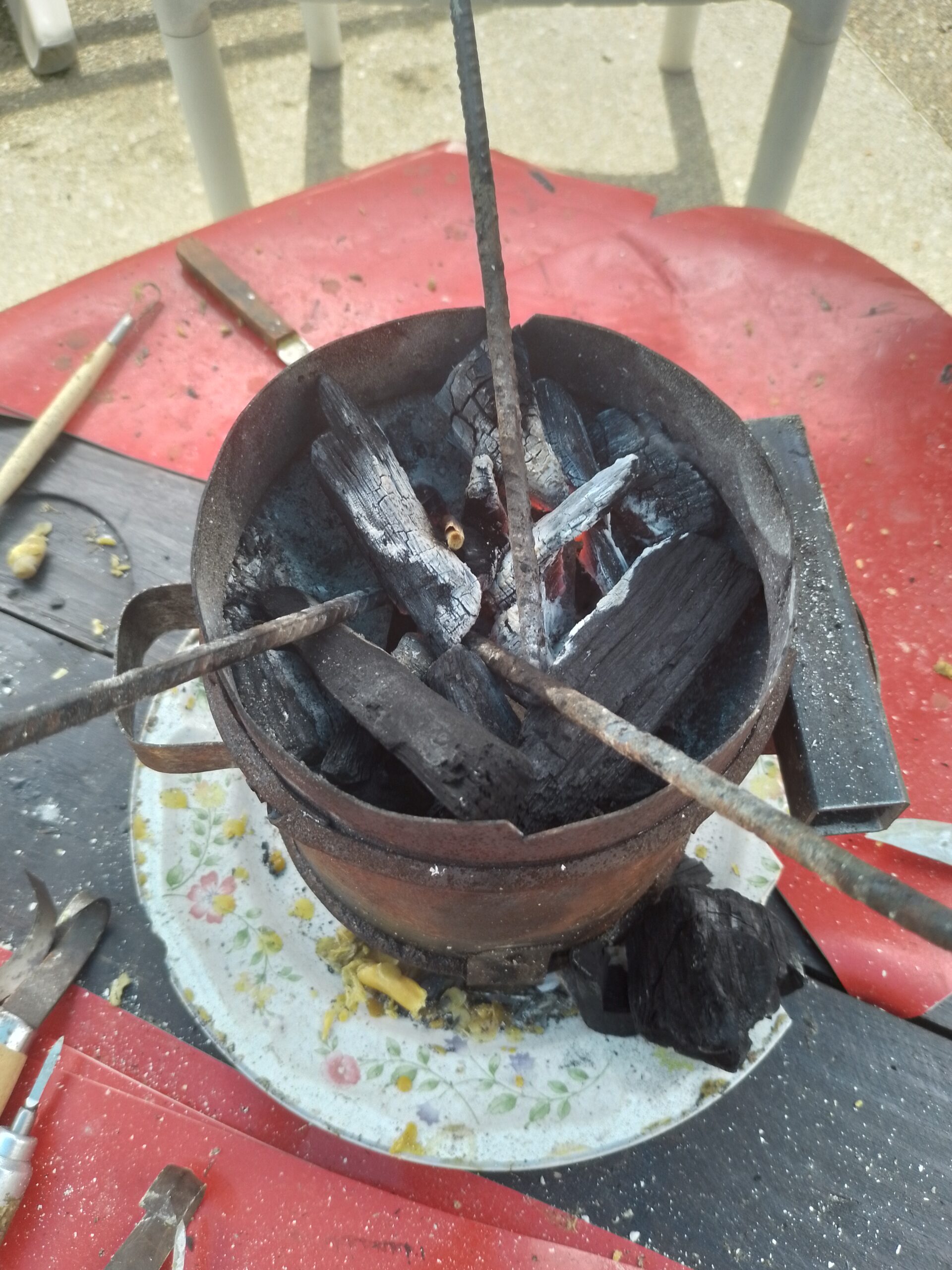 – Séchage du moule et cuisson au feu de bois, pour la récupération de la cire d’abeille.